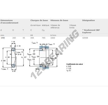 The Tapered Roller Bearing, known as 32938-SKF SKF, has an inner diameter of 190 mm, an outer diameter of 260 mm and a thickness of 45 mm.