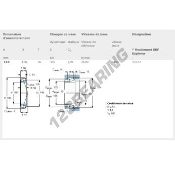 The Tapered Roller Bearing, known as 33122-SKF SKF, has an inner diameter of 110 mm, an outer diameter of 180 mm and a thickness of 56 mm.