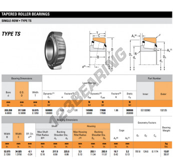 The Tapered Roller Bearing, known as EE132083-132125-TIMKEN TIMKEN, has an inner diameter of 203.2 mm, an outer diameter of 317.5 mm and a thickness of 53.975 mm.