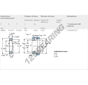 The Tapered Roller Bearing, known as L555249-L555210-SKF SKF, has an inner diameter of 292.1 mm, an outer diameter of 374.65 mm and a thickness of 47.63 mm.